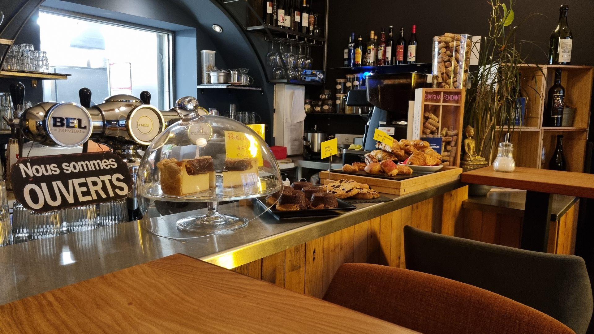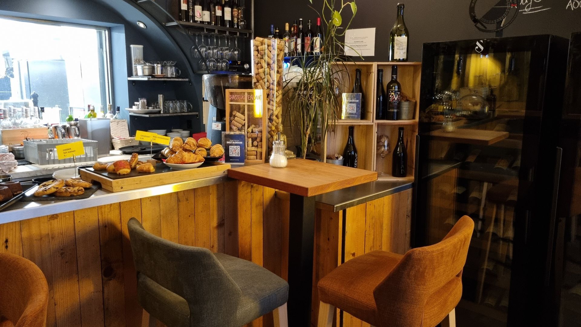 Au rez-de-chaussée, notre café convivial avec ses tables en bois, son canapé et ses fauteuils vous accueille dès 8h avec une offre alléchante pour votre petit-déjeuner : nos pancakes sont fait maison et minute. Idem pour notre granola, yaourt nature et fruits. Nous servons des jus de fruits et légumes frais, du lait végétal, du bon café et une sélection choisie de thés en vrac.